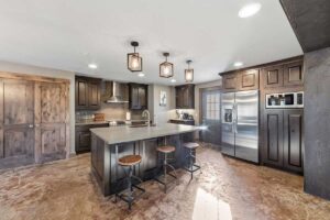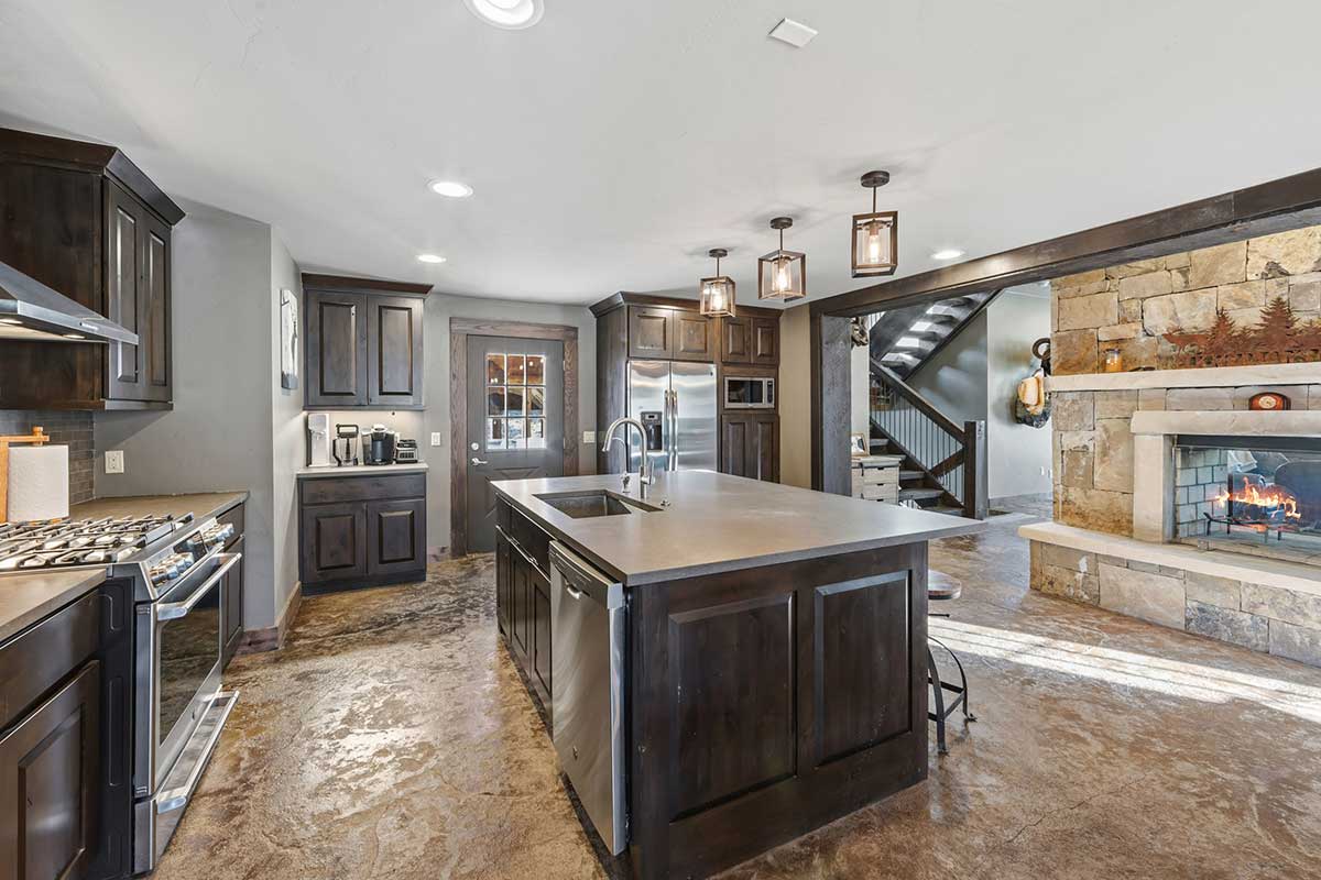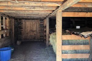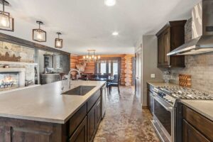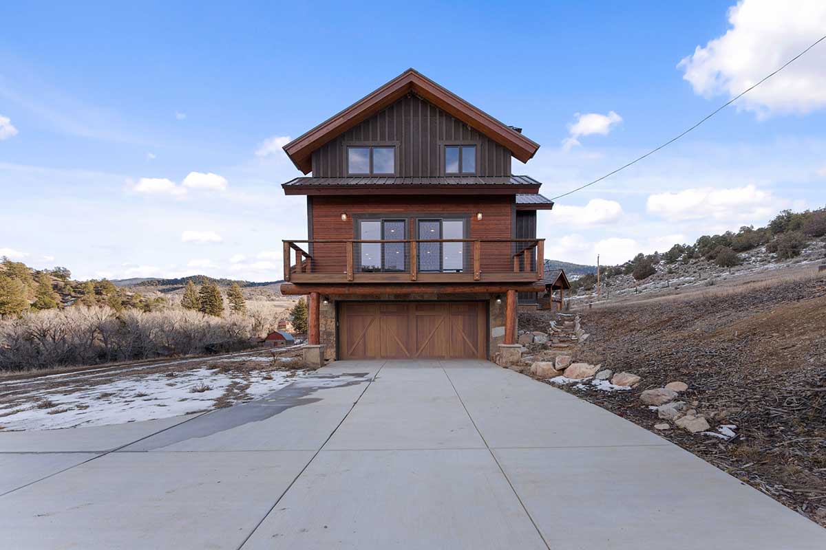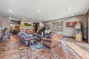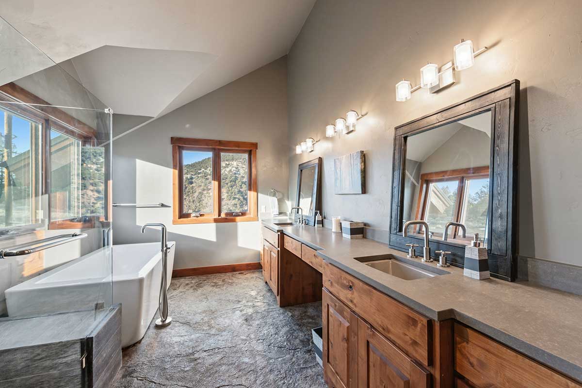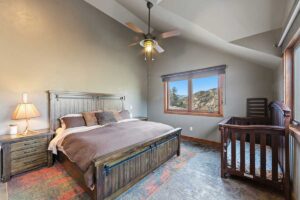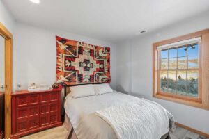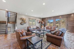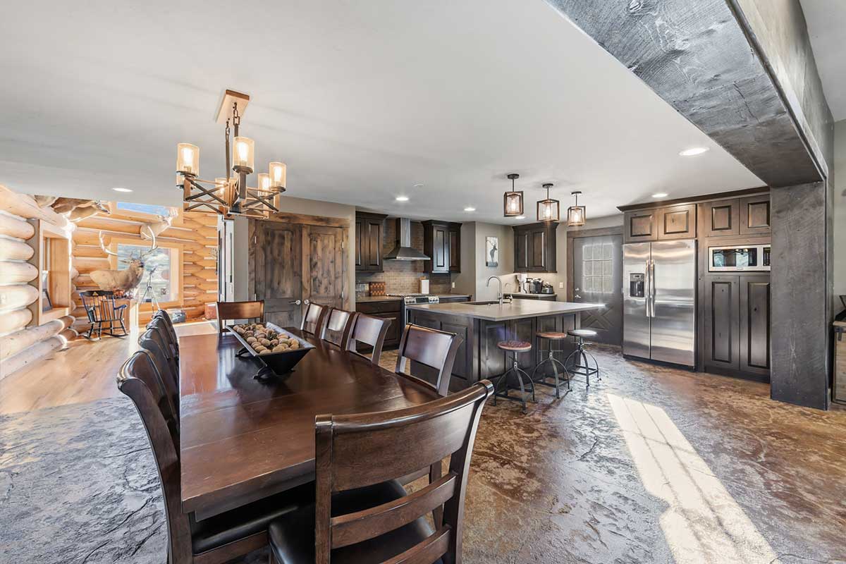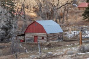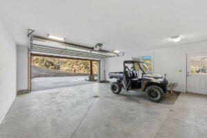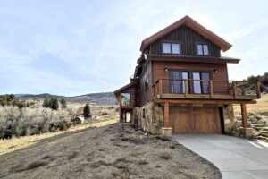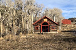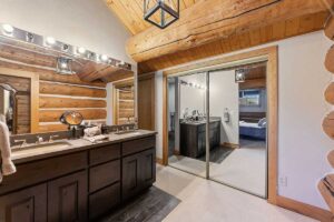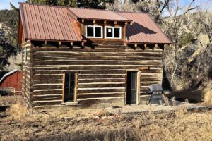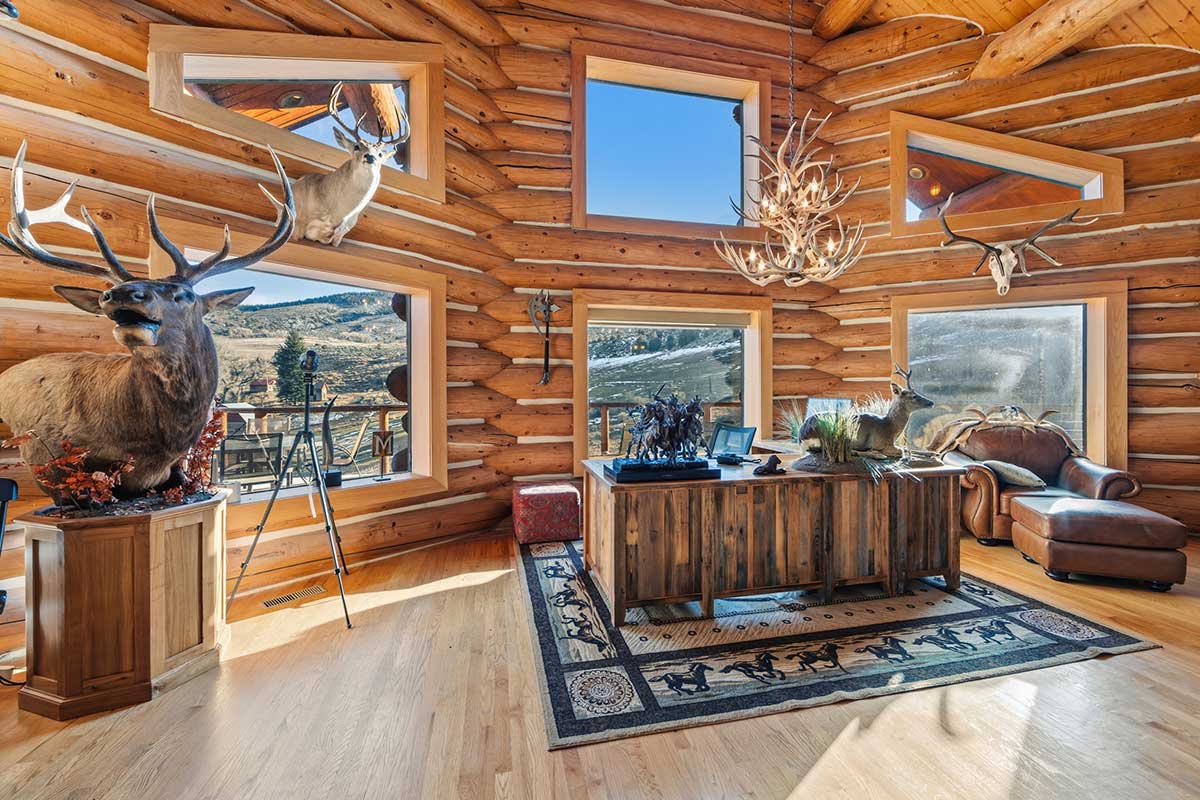 Improvements include a 4,873-square-foot log-and-mountain-modern main residence with three bedrooms and three and one-half baths. Originally constructed in 1994, the home was expanded in 2015 to include a primary suite, an open-concept great room, an updated kitchen, and an attached two-car garage. A separate 928 square foot caretaker’s cabin with one bedroom and one bath is located near the entrance of the ranch, providing privacy from the main home. Additional improvements include a 556-square-foot guest cabin, an original log horse barn with a hay loft, and two additional historic log cabins, one of which formerly served as the Sheep Creek post office and is now used as a game and bunk room. The second cabin is currently being remodeled and offers future potential as a guest residence, studio, or office.